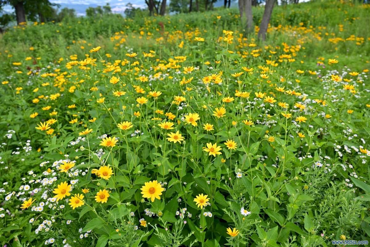 棉花般的云朵让太空似漫画梦境,漫天遍地的小黄花,如点点繁星弯曲至山顶。